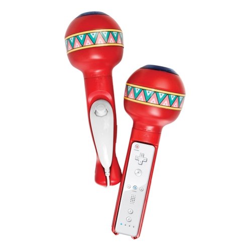 With the Maracas for Wii you can enjoy those Maraca based video games as if you were actually celebrating a big fiesta! The large rattles on these Maracas contain small plastic pellets which produce a rattling sound every time you shake these Maracas. In each grip there is a compartment where the Wii remote and nunchuk fit securely into. Just connect the Wii remote and nunchuk and shake these Maracas to the rhythm of the Wii game beat! Compatible with the following games: Samba de Amigo or any other Maraca based rhythm game that uses both the Wii Remote and Nunchuk